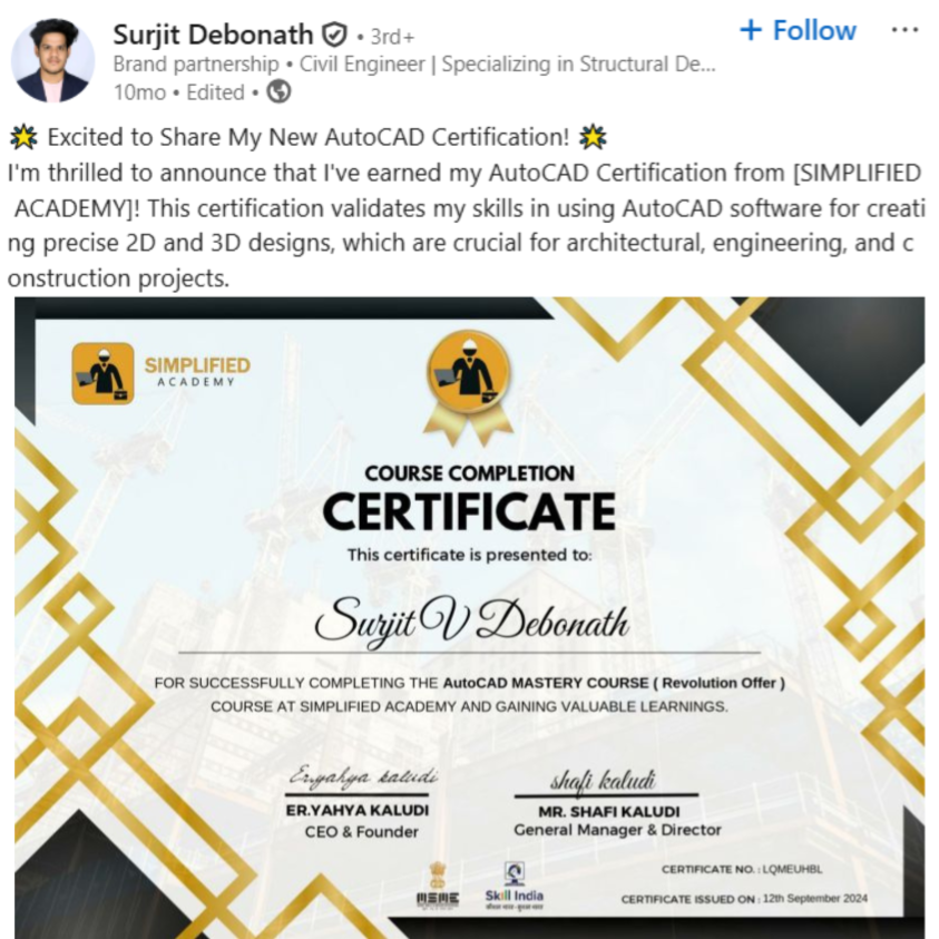 Upon completing this Course , you’ll earn an e-certificate just like this—recognizing your advanced skills in AutoCAD !