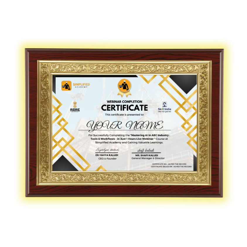 Upon Successful Completion Of The Workshop, Participants Will Receive A Certificate,verifying Their Newly Acquired Skills In Mastering AI In AEC Industry : Tools & Workflows From Idea To Execution A Valuable Addition To Any Construction Or Engineering Resume. All Mastered In Just 1 Hour !